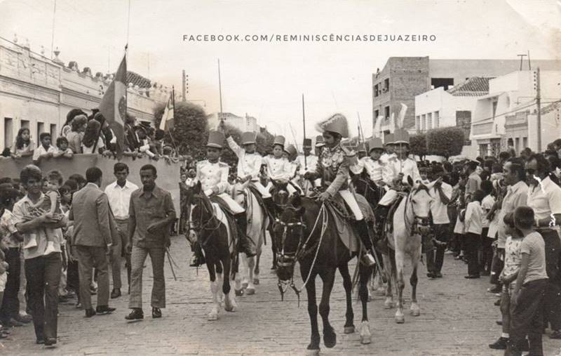 Todo mundo preparado para ir às ruas assistir ao desfile de 7 de setembro? Em Juazeiro (BA), esse momento histórico da nação era reproduzido como mandava o figurino. Na foto, o desfile da Escola Dr.Edson Ribeiro, passando pela Rua Cel.João Evangelista (Rua da 28) no final dos anos 1960, início de 70. O desfile trazia D. Pedro e sua tropa no grito do Ipiranga. O personagem D. Pedro I foi representado pelo estudante José Alberto Freire (em memória). À esquerda, na segunda coluna, com braço levantado seu irmão, Antonio Alberto Ribeiro Freire.