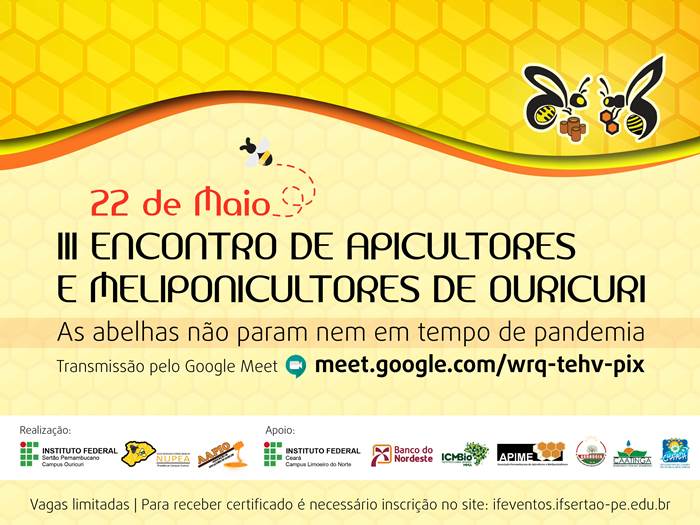Ouricuri (PE), no Sertão do Araripe, sediará nesta sexta-feira (22) a 3ª edição do Encontro de Apicultores e Meliponicultores. O evento é realizado pelo Núcleo de Pesquisa e Extensão de Abelhas (NUPEA) do campus local do IF Sertão-PE. Com o tema ‘As abelhas não param nem em tempo de pandemia’, o encontro servirá também para celebrar o Dia do Apicultor e o sexto aniversário do NUPEA, e contará com três palestras. Devido ao atual cenário causado pelo novo coronavírus (Covid-19), esta edição será realizada por videoconferência, via aplicativo Google Meet . As inscrições são gratuitas e vão ser feitas através do site IF Eventos. As vagas são limitadas. O coordenador do NUPEA e professor do campus Ouricuri, Társio Alves, destaca […]