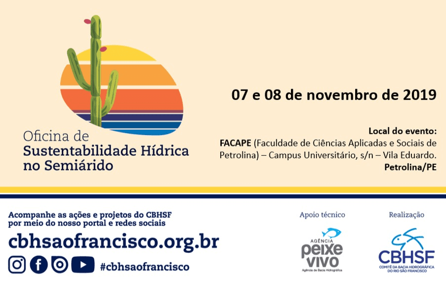 O Comitê da Bacia Hidrográfica do Rio São Francisco (CBHSF) realizará, nos dias 7 e 8 de novembro, em Petrolina, a oficina de sustentabilidade hídrica do semiárido. O evento vai acontecer na Faculdade de Ciências Aplicadas e Sociais de Petrolina (Facape). A oficina iniciará a partir das 8h30 do dia 7, e vai abordar temáticas voltadas para a utilização da água, energia solar para agricultura familiar, agricultura sustentável, além de dar espaço para a apresentação de experiências exitosas de convivência com o seminário. No dia 8, o evento será encerrado às 17h com uma visita às dependências do Instituto Regional da Pequena Agropecuária Apropriada (IRPAA) em Juazeiro (BA). O evento contará com palestras ministradas por representantes das Câmaras Técnicas do […]