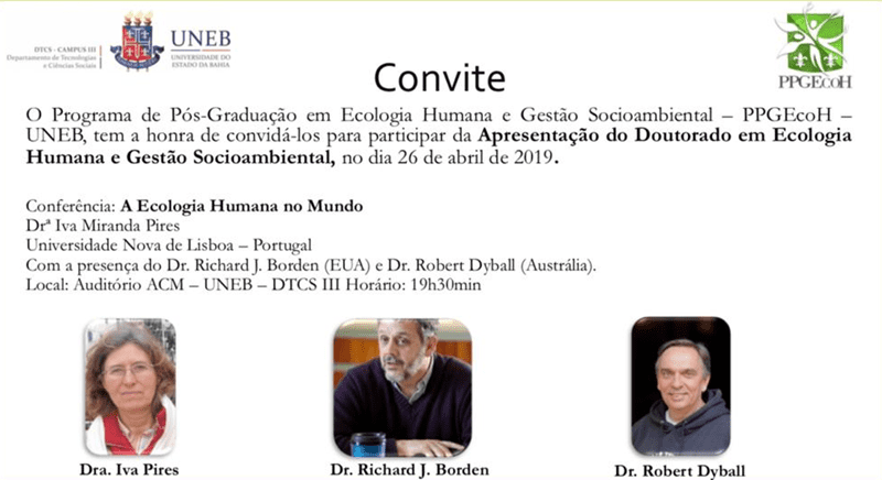 A Universidade do Estado da Bahia (Uneb), por meio do Programa de Pós-Graduação em Ecologia Humana e Gestão Socioambiental (PPGEcoH), realizará nesta sexta-feira (26) a conferência de apresentação do doutorado em Ecologia Humana e Gestão Socioambiental, no auditório Antônio Carlos Magalhães, do Departamento de Tecnologia e Ciências Sociais (DTCS) da Uneb, em Juazeiro, às 19h30. O tema da conferência é ‘A Ecologia Humana no Mundo’ e será ministrada pela presidente da Sociedade Internacional de Ecologia Humana e professora da Faculdade de Ciências Sociais e Humanas da Nova de Lisboa, em Portugal, Iva Miranda Pires. O evento é voltado para estudantes de graduação e pós-graduação, pesquisadores, professores e demais interessados na temática. A entrada é gratuita.