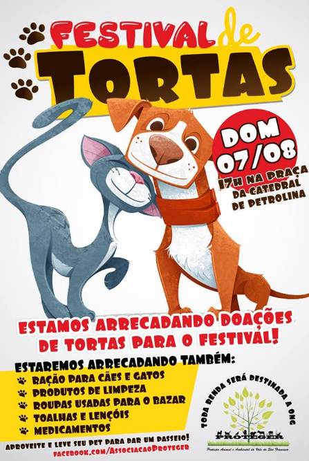 A ONG Proteger realizará um festival beneficente de tortas em Petrolina. O evento acontecerá neste domingo (7), a partir das 9h, na Praça do Bambuzinho, e no domingo (24), a partir das 17h na Praça da Catedral, Centro de Petrolina. O festival, sem fins lucrativos, servirá para arrecadar dinheiro à ONG, que é voltada a cuidar de cães e gatos abandonados e atua na região desde 2012. Atualmente, a Proteger está com cerca de 150 cães e gatos sob cuidados e à espera de adoção responsável. Por isso, a ONG realiza eventos com frequência, já que o número de contribuintes e parceiros é pequeno. Doações No dia do festival, a Proteger também estará recebendo doações como ração, produtos de limpeza, medicamentos […]