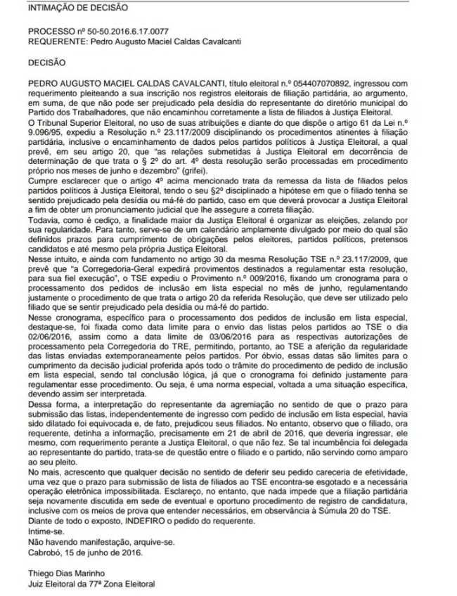 Em Cabrobó (PE), no Sertão do São Francisco, a coligação do pré-candidato a prefeito Marcílio Cavalcanti (PMDB) sofreu uma séria baixa. O filho do ex-prefeito Eudes Caldas, Pedro Augusto Caldas, teve seu registro de filiação negado pela justiça eleitoral. Pedro seria o vice na chapa de Marcílio. Ele alega que o seu partido, PT, não teria enviado corretamente a lista de filiados ao Tribunal Superior Eleitoral (TSE). Mas uma fonte do Blog informou que Pedro também tem sua parcela de culpa, uma vez que no último dia 21 de abril, quando ainda havia prazo para recorrer, ele tinha tomado conhecimento e não entrou com requerimento junto ao Cartório Eleitoral. Confiram abaixo decisão do juiz Thiego Dias Marinho, da 77ª zona […]