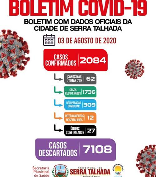 A Secretaria de Saúde de Serra Talhada (PE), no Sertão do Pajeú, confirmou no boletim de ontem (3) mais 62 casos positivos do novo coronavírus (Covid-19) nas últimas 72 horas, totalizando 2.084 infectados pela doença. O município também registrou seu 27º óbito. Trata-se de uma idosa de 68 anos. Ela era hipertensa, diabética e estava internada no Hospital Agamenon Magalhães, onde faleceu no último dia 31 de julho, mas o resultado do exame só foi divulgado nesta segunda-feira. O número de casos suspeitos subiu para 71 e o de casos descartados para 7.108. Quanto à evolução dos casos confirmados, o município tem 1.736 pacientes recuperados, 309 em tratamento domiciliar e 12 em leitos de internamento. Em relação aos profissionais de […]