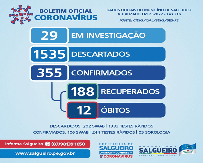 Mais 17 casos do novo coronavírus (Covid-19) foram registrados pela Secretaria de Saúde de Salgueiro (PE) nesta quinta-feira (23). São nove pacientes do sexo masculino e oito do sexo feminino confirmados através de testes rápidos. Todos os novos casos encontram-se em isolamento domiciliar supervisionado pelas Unidades de Saúde do município. No boletim também foram informados mais 46 pacientes curados da Covid-19. Com essa atualização, Salgueiro tem 355 casos confirmados; destes, estão contabilizados 12 óbitos e 188 recuperados. No total, a cidade tem 155 casos ativos.