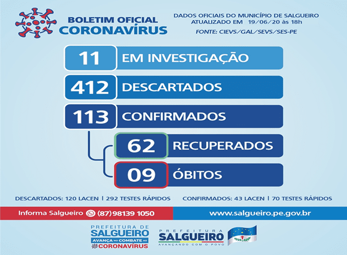 A Secretaria de Saúde de Serra Talhada informa que foram confirmados mais 29 casos positivos de Covid-19 e 1 óbito nesta sexta-feira (19), totalizando 351 casos. São 17 pacientes do sexo feminino e 12 do sexo masculino, com idades entre 7 meses e 69 anos. O número de casos suspeitos aguardando resultados caiu para 20 e o número de casos descartados subiu para 1.701. Entre os casos confirmados, o número pacientes recuperados clinicamente subiu para 180, enquanto 159 estão em isolamento domiciliar monitorado e 4 pacientes em leitos de isolamento. Em relação aos profissionais de saúde contagiados, 23 já estão recuperados e 7 permanecem em isolamento domiciliar. O oitavo óbito confirmado é de um paciente do sexo masculino, de 69 […]