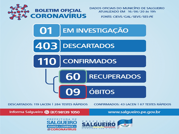 Em boletim divulgado nesta terça-feira (16), Salgueiro (PE), no Sertão Central, registrou mais sete casos positivos para o novo coronavírus (Covid-19). São quatro pacientes do sexo masculino e três do sexo feminino, que receberam o resultado através de testes rápidos. Todos se encontram em isolamento domiciliar e serão supervisionados pela Unidade de Saúde e pela Central de Monitoramento da Covid-19. A Secretaria de Saúde também confirmou que cinco pacientes estão recuperados da doença. Com essa atualização nos dados, Salgueiro registra 110 casos confirmados do novo coronavírus, 60 pacientes recuperados e nove óbitos pela doença. Apenas um caso está sendo investigado. A prefeitura pede ainda à população que atenda as recomendações sanitárias e obedeça o distanciamento social, pois o momento ainda […]