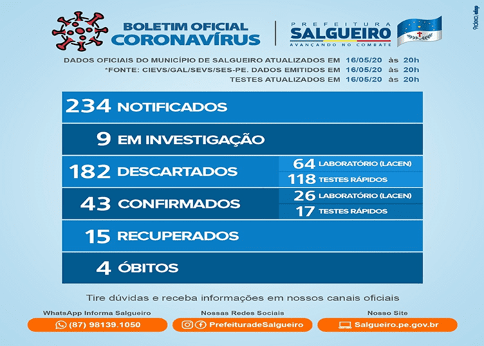 Com 110 casos confirmados do novo coronavírus (Covid-19) em Petrolina até o momento, o boletim divulgado neste domingo (17) pela Secretaria Municipal de Saúde (SMS) seguiu sem alterações nas últimas 24 horas. No total são 83 casos confirmados através de testes rápidos feitos pela prefeitura e 27 diagnosticados através de exames do Laboratório Central de Pernambuco (Lacen-PE) laboratorial. Curas clínicas somam 41, com quatro óbitos. Também não houve alterações nos dados relacionados à Síndrome Respiratória Aguda Grave (SRAG). Em investigação são 46 casos, enquanto 30 já foram descartados. Confirmados somam nove casos, além de um óbito.