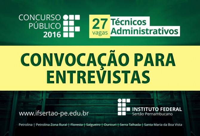 O Instituto Federal de Educação, Ciência e Tecnologia do Sertão Pernambucano (IF Sertão-PE) divulgou, após análise dos recursos, o resultado parcial do concurso público para provimento de cargos efetivos de Técnico-Administrativos, referente ao edital nº 36/2016. Também foram publicadas as convocações para as entrevistas dos candidatos autodeclarados negros, bem como dos aprovados para a Prova Prática do Cargo de Tradutor e Intérprete de Linguagem de Sinais. O resultado parcial e as convocações podem ser encontrados aqui aqui.