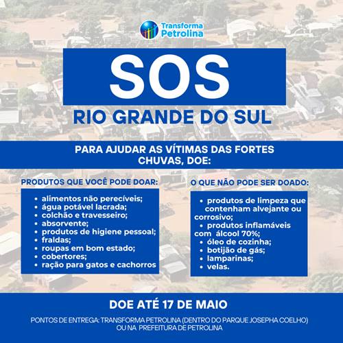 A tragédia humanitária provocada pelas fortes chuvas no Rio Grande do Sul levou a prefeitura, através do programa de voluntariado Transforma Petrolina, a iniciar uma campanha para arrecadar doações destinadas às vítimas em vários municípios atingidos. De acordo com o levantamento oficial da Defesa Civil gaúchas, o Estado registra quase 100 mortes, mais de 156 mil pessoas desalojadas e cerca de 48,2 mil pessoas temporariamente em abrigos. A população de Petrolina pode doar alimentos não perecíveis; água potável lacrada; colchão; travesseiro; absorvente; produtos de higiene pessoal; fralda geriátrica e infantil; roupas em bom estado; cobertores; e ração para gatos e cachorros. Em virtude da logística de transporte, não podem ser doados produtos de limpeza que contenham alvejante ou corrosivo, produtos […]