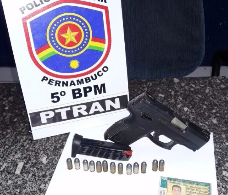 Um homem foi preso por porte ilegal de arma de fogo na madrugada desta quarta-feira (1), no bairro São Joaquim, na zona norte de Petrolina. Segundo o 5º Batalhão da Polícia Militar (5ºBPM), o homem estava dentro de um carro, quando foi abordado pelos policiais. O suspeito estava com uma pistola calibre 380, um carregador e várias munições. O suspeito e a arma apreendida foram conduzidos à Delegacia de Polícia Civil (DPC) de Plantão. (foto: 5°BPM/divulgação)