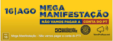 Em meio à crise que atinge o governo Dilma Rousseff, alguns movimentos sociais já estão planejando mais uma manifestação contra o governo federal, em Petrolina. Segundo informações repassadas ao Blog, a nova manifestação está sendo organizada pelos movimentos ‘Vem Pra Rua Brasil’ e ‘Brasil Livre’, que pretendem ir às ruas da cidade com o tema “Não vamos pagar a conta do PT”. A manifestação está marcada para acontecer no dia 16 de agosto, com concentração às 15h30, em frente à prefeitura municipal de Petrolina. Na cidade, o movimento também trará como pautas temas como a conservação do Velho chico e o descaso com pontos turísticos da cidade.