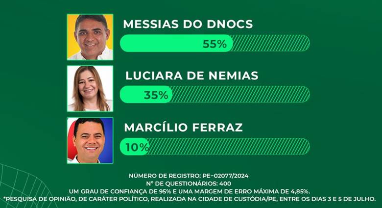 A corrida municipal em Custódia (PE), Sertão do Moxotó, vem sendo liderada pelo pré-candidato a prefeito Messias do Dnocs. É o que aponta uma pesquisa realizada pelo Instituto Data Trends. Messias aparece com 55% das intenções de voto, seguido por Luciara de Nemias com 35% e Marcílio Ferraz com 10%. O levantamento foi realizado em Custódia entre os dias 3 e 5 de julho, com 400 entrevistados. O grau de confiança é de 95% e apresenta uma margem máxima de erro de 4,85%. O número de registro é PE-02077/2024.