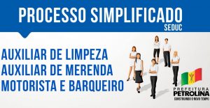 A Secretaria de Educação de Petrolina abrirá inscrições para o processo de seleção simplificada para a contratação de auxiliar de cozinha, auxiliar de limpeza, motorista e barqueiro para transporte escolar. Os selecionados desempenharão suas funções na rede de ensino municipal na sede e zona rural em regime temporário, de contrato no período de um ano, podendo ser renovado por mais um, nos termos da Lei Municipal n.º 2.416/2011.