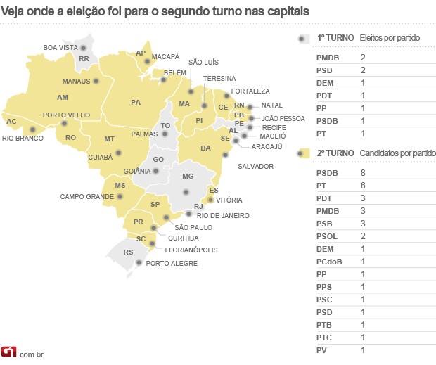 Entre os candidatos à reeleição nas capitais, apenas Luciano Ducci (PSB), em Curitiba, não foi ao segundo turno. João Castelo (PSDB), em São Luís; Elmano Férrer (PTB), em Teresina; e Roberto Góes (PDT), Macapá, disputam o segundo turno, que acontece no dia 28 de outubro. (Do G1 c/ilustração)