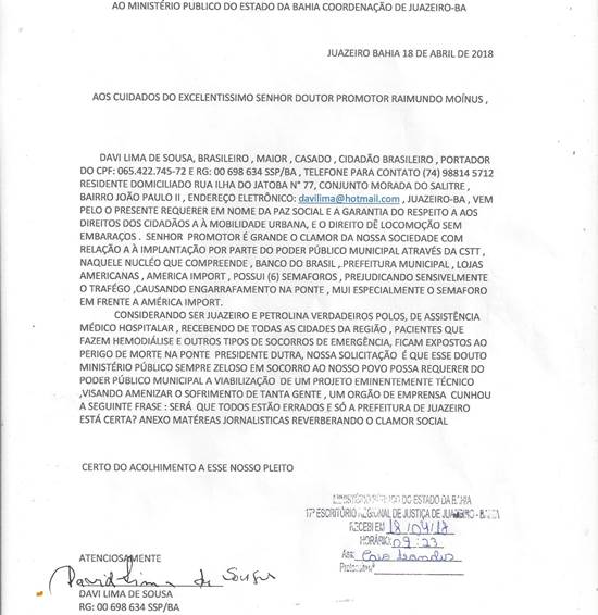 Por meio de documento, ele solicitou um Termo de Ajuste de Conduta (TAC) da prefeitura, comprometendo-se a realizar um projeto eminentemente técnico na área onde os equipamentos foram instalados – a exemplo das imediações do Banco do Brasil (BB), Lojas Americanas e América Import. Este último ponto é considerado o mais crítico, porque impede o tráfego de veículos vindo de Petrolina (PE), prejudicando sobretudo o transporte de pacientes por conta dos engarrafamentos.