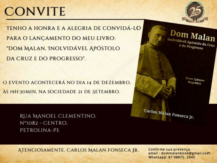 Dentro das comemorações do Jubileu de 25 anos do Seminário São José, da Diocese de Petrolina, o seminarista Carlos Malan Fonseca Júnior conta, através do livro “Dom Malan – Inolvidável Apóstolo da Cruz e do Progresso”, a biografia do primeiro bispo de Petrolina. A publicação retrata a vida e a obra do religioso.