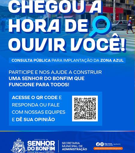 Em Senhor do Bonfim, Norte da Bahia, a Secretaria de Administração da prefeitura municipal iniciou uma consulta pública para ouvir a população sobre a proposta de reimplantação do sistema de estacionamento rotativo Zona Azul na cidade. A iniciativa atende ao encaminhamento da audiência pública realizada pela gestão municipal no último dia 28 de março, quando ficou definido que a pasta ouviria os bonfinenses antes de qualquer medida sobre o tema.