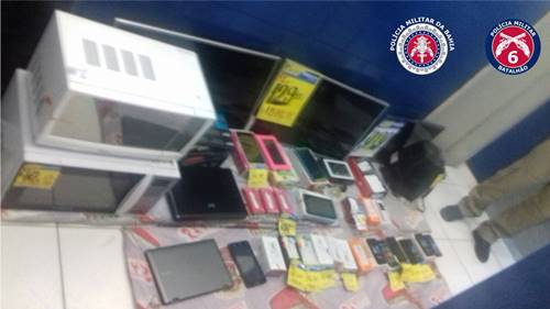 Na carroceria do carro havia aparelhos de TV, celulares, tablets, notebooks e forno microondas. Os quatro, todos moradores da capital baiana, confessaram que os produtos foram furtados de uma loja de móveis e eletrodomésticos, situada à Avenida 2 de Julho, e de outra de aparelhos celulares, localizada à Rua Barão de Cotegipe. Os acusados, juntamente com o material, foram apresentados na Delegacia de Polícia Civil (DPC) local e autuados em flagrante. (Foto: 6°BPM/divulgação)