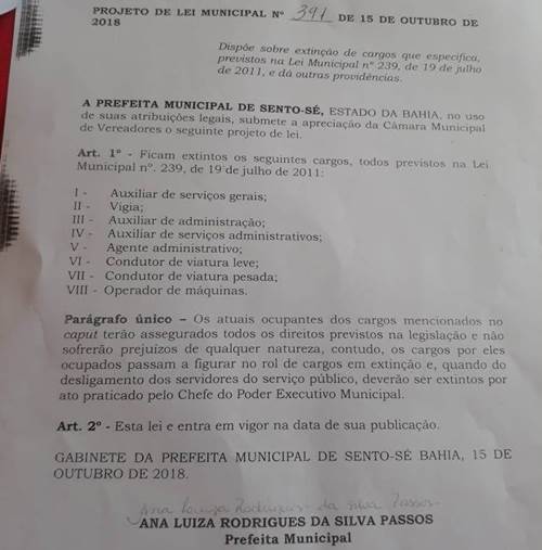 Em Sento-Sé, no norte da Bahia, uma controvérsia preocupa os servidores municipais. O motivo é um projeto de lei, de autoria do Executivo, o qual prevê a extinção de oito cargos do quadro efetivo: auxiliar de serviços gerais; vigia; auxiliar de administração; auxiliar de serviços administrativos; agente administrativo; condutor de viatura leve; condutor de viatura pesada; e operador de máquinas.