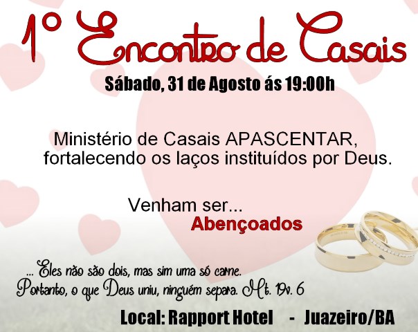 O evento, que acontecerá a partir das 19h no Rapport Hotel, tem o próposito de melhorar a convivência a dois, diante dos problemas que a família enfrenta nos dias de hoje.