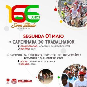 A Prefeitura de Serra Talhada, no Sertão do Pajeú, realizará nesta segunda-feira (1º/05) a 5ª Caminhada do Trabalhador e a Caravana da Cidadania Especial de Aniversário – “Bem-estar e qualidade de vida” -, abrindo oficialmente a programação dos 166 anos de emancipação política do município. A programação segue até o dia 31 de maio com uma série de inaugurações, ordens de serviço e shows musicais.