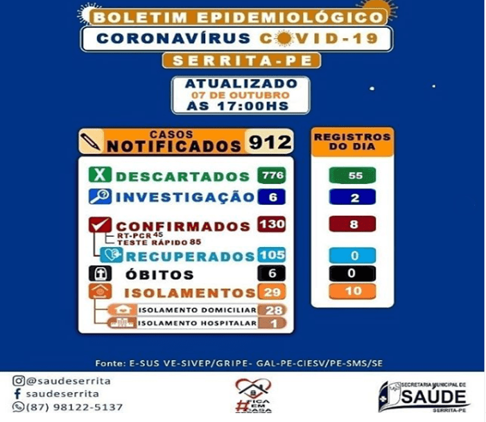 Dessa forma Serrita totaliza 130 infectados, 105 curas clínicas, seis óbitos e 29 pessoas em isolamento – além de seis casos em investigação e 776 descartados.