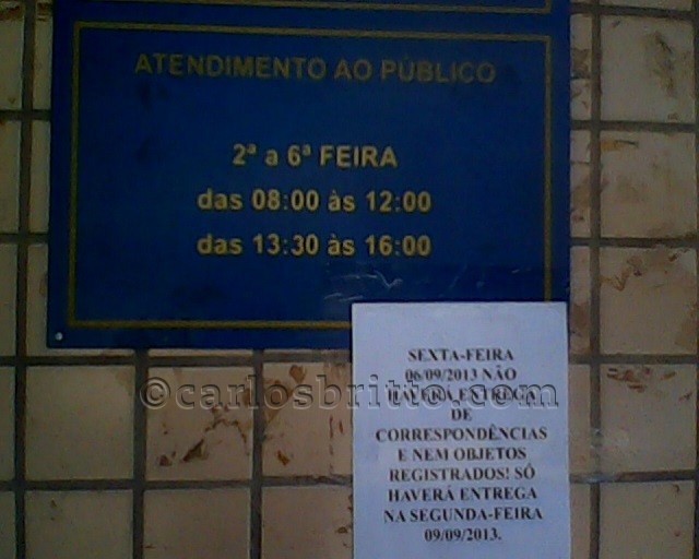 Na última quarta-feira (4) à tarde, fui até à agência e vi um comunicado na parede informando que a entrega de correspondências só acontecerá pela manhã. Retornei na sexta-feira (6) de manhã e já vi observei outro aviso – dentro e fora da agência – informando que o serviço só seria realizado na segunda-feira (9).