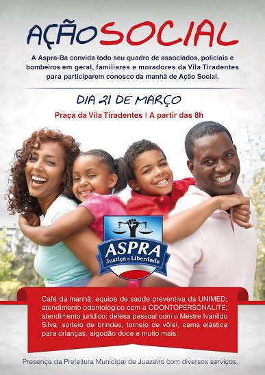 A Associação de Policiais e Bombeiros e de seus Familiares do Estado da Bahia (Aspra-BA) em Juazeiro realiza no próximo sábado (21), a partir das 08h da manhã, na Praça da Vila Tiradentes, uma ação social que tem como foco principal realçar e possibilitar um dia diferenciado para a comunidade do referido bairro e suas adjacências.