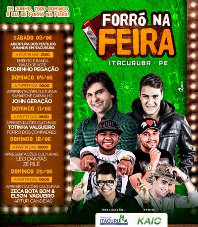 A abertura será no sábado (3/06), a partir das 21h, com Emérito e Banda Baião de Xote e Pedrinho Pegação, no pátio da feira. O local está sendo caracterizado por uma equipe de artistas itacurubenses, coordenada pela secretária de Cultura, Cristiana Almeida.