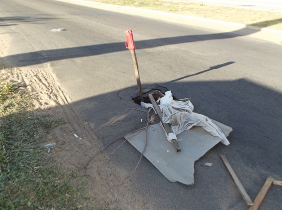 Após um bueiro estourar, moradores da área improvisaram uma sinalização – que evidentemente não é a mais adequada. A intenção foi boa, mas todo cuidado é pouco a fim de evitar acidentes no local.