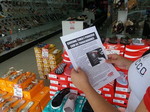 Integrantes da direção e funcionários do Sindicato dos Trabalhadores do Comércio de Petrolina (Sintcope) realizaram na manhã desta segunda-feira (3) uma panfletagem para divulgar os prejuízos que o projeto que amplia irrestritamente a terceirização trará aos trabalhadores. O material distribuído, além dos nomes dos deputados que votaram a favor do governo e contra os trabalhadores, também continha informações sobre as reformas da Previdência e Trabalhista e a ameaça que representam aos direitos dos trabalhadores.