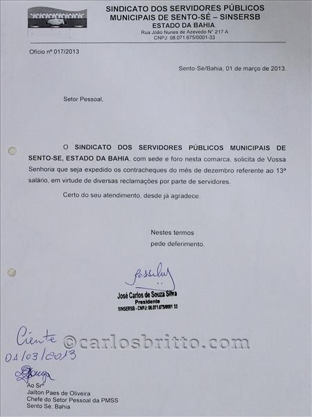 Diante de tantas reclamações, o Sindicato dos Servidores Públicos Municipais de Sento-Sé enviou, no dia 1° de março de 2013, o ofício n° 017/2013, a Jailton Paes de Oliveira, chefe do setor de RH, cobrando o envio dos contracheques. Porém, até o momento, nenhum servidor recebeu o seu. O Blog reserva espaço para algum representante da prefeitura se pronunciar sobre o assunto.