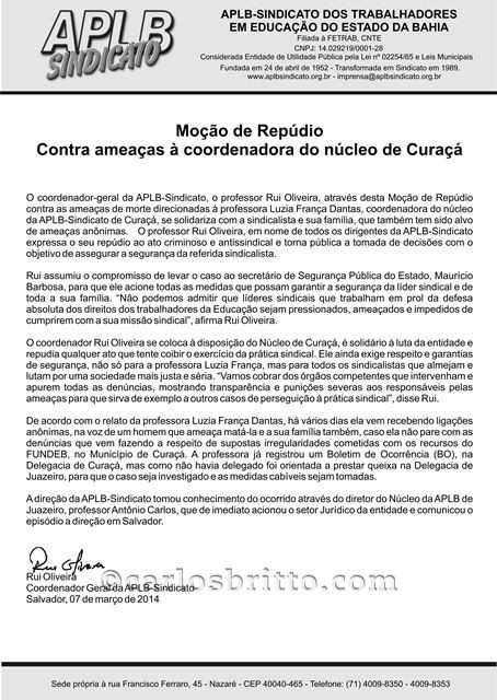 O Sindicato dos Trabalhadores em Educação do Estado da Bahia (APLB) emitiu uma moção de repúdio contra as ameaças de morte direcionadas a uma professora de Curaçá, no Norte do Estado. Luzia França Dantas estaria recebendo ligações anônimas, na voz de um homem, ameaçando matar ela e sua família.