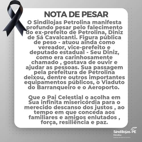 O Sindilojas é mais uma instituição a se manifestar acerca do falecimento do ex-prefeito de Petrolina e ex-deputado estadual Diniz Cavalcanti (Seu Diniz), ocorrido nesta quinta-feira (29). O Sindilojas citou legados importantes deixados pelo político, a exemplo do Viaduto dos Barranqueiros e do aeroporto.