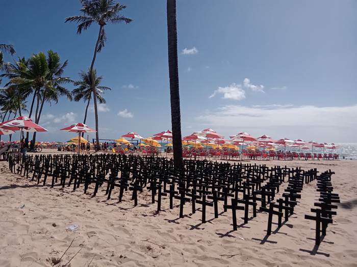 Para chamar a atenção da população sobre o aumento da violência no estado de Pernambuco, o Sindicato dos Policiais Civis (Sinpol) realizou na manhã desta sexta-feira (31) um protesto na Orla de Boa Viagem, Zona Sul do Recife. Durante o ato, 3.223 cruzes foram espalhadas na areia da praia, para simbolizar as 3.223 mortes registradas em 2021 até o dia 30 de dezembro. Essa é a primeira de uma série de atos marcados em todas as regiões de Pernambuco que acontecerão no mês de janeiro.