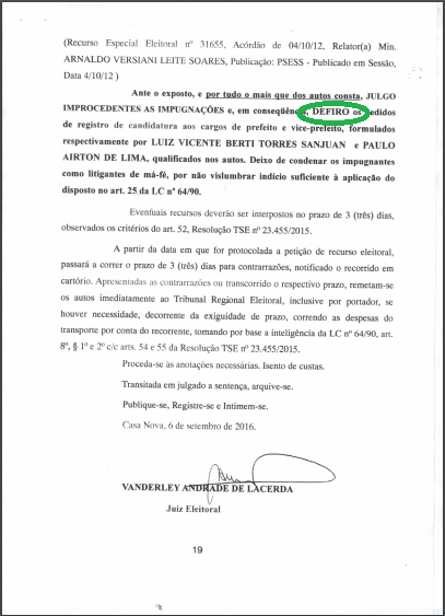 Em Sobradinho, no norte da Bahia, o juiz Vanderley Andrade de Lacerda, da 66ª Zona Eleitoral, deu parecer favorável ao pedido de registro de candidatura do prefeito e do vice-prefeito, Luiz Vicente Berti (PSD) e Paulo Airton de Lima (PSB), respectivamente. Ambos disputam a reeleição no município pela coligação ‘Juntos Somos Mais Fortes’.O juiz considerou “sem fundamento” o pedido de impugnação da chapa governista, protocolado pelo grupo de oposição. Confira o parecer acessando aqui. (foto/divulgação)