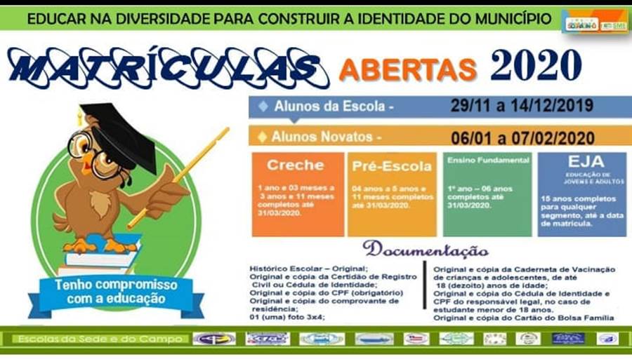 Atendendo às exigências do EducaSenso, a portaria nº 05/29 de novembro de 2019 – que estabelece as normas, procedimentos e cronograma para renovação e efetivação da matrícula de estudantes novos e transferidos no ano de 2020 – destaca que serão asseguradas pela Rede Municipal de Ensino as vagas para as modalidades ofertadas pela portaria e garante que o estudante da zona rural terá prioridade de matrícula no turno em que a prefeitura disponibilizar o transporte escolar.