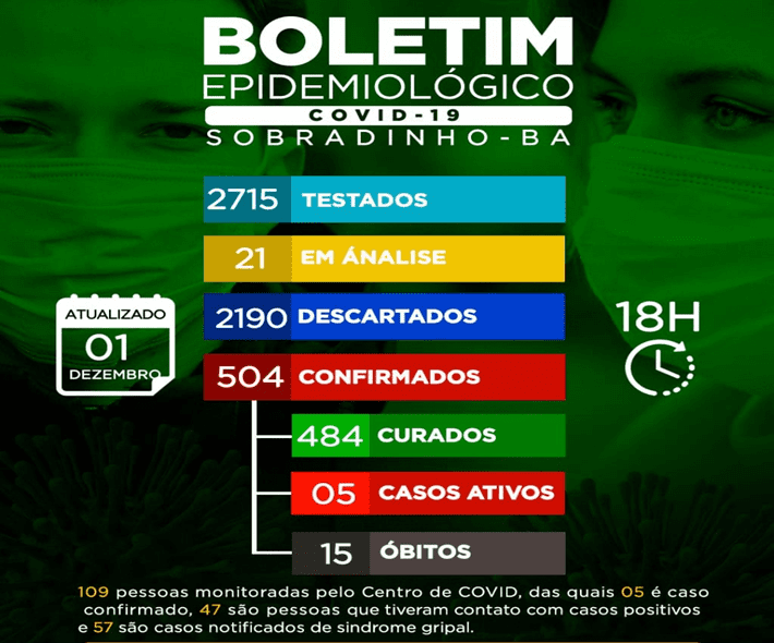Com essa atualização, o município contabiliza agora 504 infectados, 484 curas clínicas, cinco casos ativos e 15 óbitos. O boletim destaca ainda que até esta terça-feira a ala 2 do hospital municipal Maria Auxiliadora Torres possui um paciente internado suspeito, sendo acompanhado pela equipe de saúde.