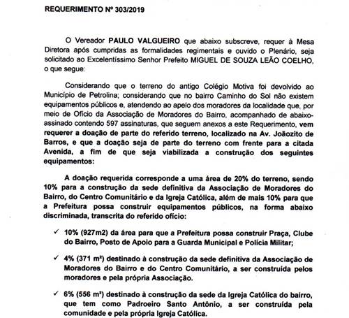 O requerimento do vereador governista Cícero Freire (PR) solicitando do prefeito Miguel Coelho (MDB) a doação de um terreno destinado à Diocese de Petrolina para a construção de uma igreja no Bairro Caminho do Sol, zona leste da cidade, foi aprovado ontem (26) na Casa Plínio Amorim, mas não passou desapercebido pelo líder da bancada de oposição, Paulo Valgueiro (MDB). Mesmo tendo dado seu aval à proposta do colega de Legislativo, Valgueiro lembrou que há cerca dois meses havia apresentando um pedido semelhante, que foi reprovado.