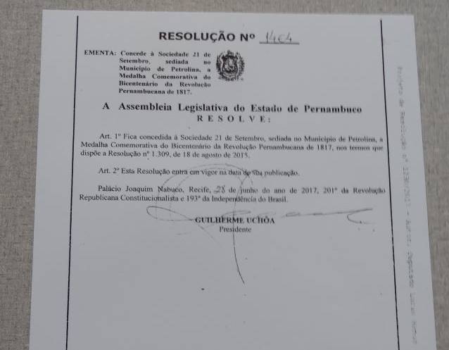 A Sociedade 21 de Setembro, em Petrolina, foi agraciada pela Assembleia Legislativa de Pernambuco (Alepe) com a Medalha Comemorativa do Bicentenário da Revolução Pernambucana de 1817. O Projeto de Resolução n°1.464/2017, de 27 de junho último, é de autoria do deputado estadual Lucas Ramos.