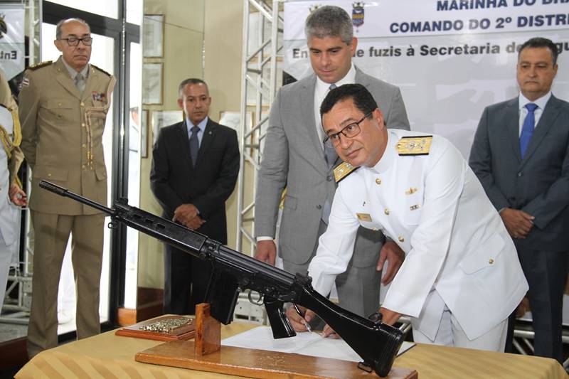 O combate às quadrilhas especializadas na Bahia ganhou reforço na manhã desta terça-feira (25), com a doação de 100 Fuzis Automáticos Leves (FAL) 7,62 mm, doados pela Marinha do Brasil à Secretaria da Segurança Pública. O governador Rui Costa e o secretário da SSP, Maurício Teles Barbosa, participaram da solenidade de repasse das armas, realizada no Comando do 2ºDistrito Naval, no bairro do Comércio.
