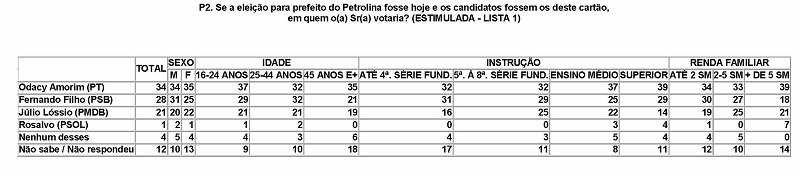 Na pergunta estimulada, quando são apresentados os nomes dos pré-candidatos, Odacy vem em primeiro com 34%; Fernando Filho é o segundo com 28% e Júlio é o terceiro com 21%.