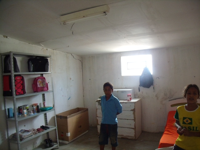 Aparecida e seus filhos continuam exposta aos riscos de um desabamento, já que a estrutura do prédio está seriamente comprometida. No quarto onde as crianças dormem, por exemplo, as rachaduras e infiltrações (foto) deixam claro o perigo de ficar no local. “Quero apenas uma segurança, uma garantia de que vou ter meu teto, só quero morar no que é meu com meus filhos, não quero incomodar ninguém“, disse Aparecida.