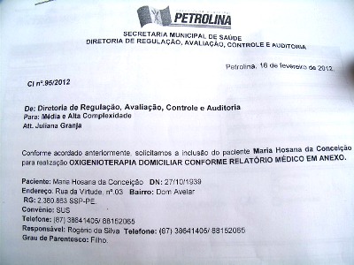 Segundo o filho de Maria Hosana, Rogério Souza, depois de reunir uma documentação e ir por mais de uma vez a secretaria de saúde do município, recebeu do órgão um documento (foto) solicitando o cilindro ao Samu. Ao chegar à unidade, foi informado de que não havia equipamentos disponíveis por causa de uma dívida da Prefeitura de Petrolina com o fornecedor.