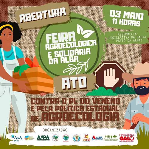 Logo mais, a partir das 11h, será realizado o ato de abertura da feira contra o PL do Veneno e pela Política Estadual de Agroecologia, com a presença de representações das entidades ligadas ao tema. O ato será transmitido pelo Instagram do deputado @marcelinogalo.