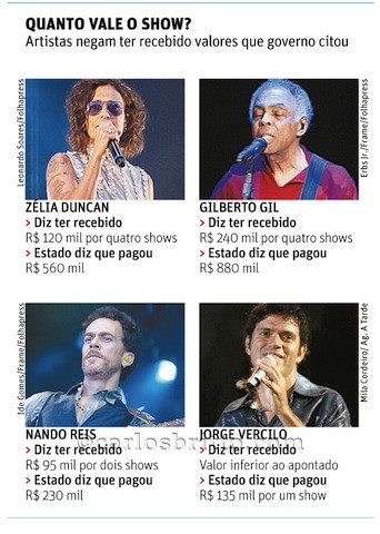 Quatro artistas contratados pelo governo do Ceará (Nando Reis, Gilberto Gil, Jorge Vercillo e Zélia Duncan) disseram que receberam menos do que o governo diz ter pago. Há suspeitas em 15 das 45 contratações para o festival. Para o Ministério Público, isso é indício de desvios. Ontem, o empresário de Zélia Duncan informou que a cantora recebeu R$ 120 mil pelo pacote de quatro shows, e não R$ 140 mil por show.