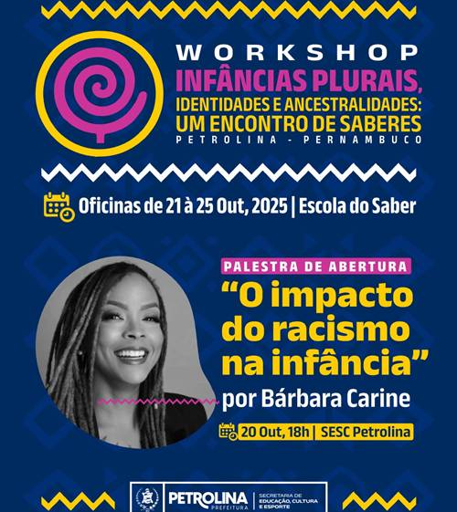 Diálogos sobre diversidade, ancestralidade e o papel da escola na construção de uma educação antirracista desde a infância marcarão o Workshop ‘Infâncias Plurais, Identidades e Ancestralidades: Um Encontro de Saberes’, que será realizado em Petrolina, de 21 a 25 deste mês, na Escola do Saber. A ação integra uma série de iniciativas do Protocolo de Combate ao Racismo implantado nas escolas da rede municipal em 2025, e é promovida pela Secretaria de Educação, Cultura e Esporte (SEDUCE). A programação terá início com a palestra “O impacto do racismo na infância”, ministrada pela professora, pesquisadora e escritora Bárbara Carine, no dia 20 de outubro, às 18h, no Sesc Petrolina. Esse momento é voltado apenas para servidores da rede municipal de educação […]