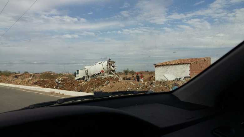 Na foto acima, um caminhão de uma empresa privada despeja restos de material de construção, na entrada do bairro, numa área de aproximadamente 700 metros quadrados (m²). Segundo informações repassadas, o terreno pertenceria à prefeitura.