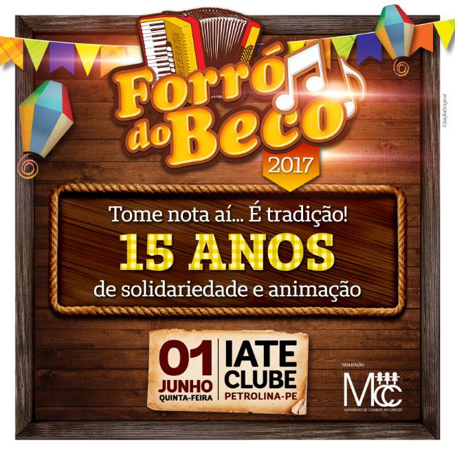 O evento acontecerá no Iate Clube, a partir das 19h, contando com a participação do sanfoneiro Targino Gondim, Jorge de Altinho, Nádia Maia, Rennan Mendes e Adãozinho de Rajada. Os ingressos custam R$ 40 (inteira) e R$ 20 (meia). O evento é realizado pelo Movimento de Combate ao Câncer (MCC), entidade sem fins lucrativos, em parceria com o Centro de Oncologia (Ceonco)/Apami.