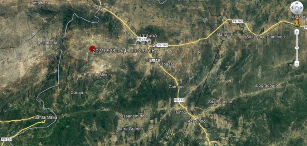 Um tremor de terra foi registrado em Jataúba e Santa Cruz do Capibaribe, no Agreste pernambucano. O registro foi feito na tarde da terça-feira (28), pelo Laboratório de Sismologia da Universidade Federal do Rio Grande do Norte (UFRN). O tremor teve magnitude de 2.0 na Escala Richter. Nenhuma ocorrência foi registrada por causa do fenômeno.